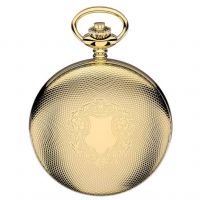 An elegant gold pocket watch with mechanical movement. This watch displays Roman numerals on a plain dial. The 17 jewel movement is hand wound to generate energy to keep the watch working. The patterned front has space for engraving initials with more space for a sentiment on the back.