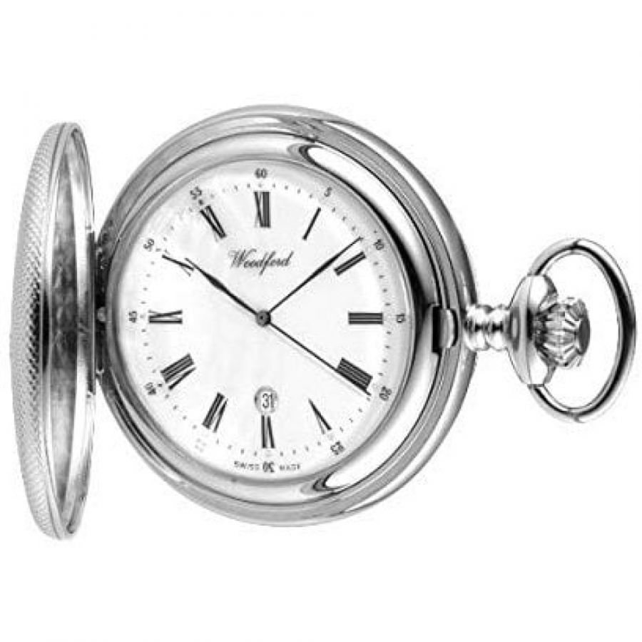 Sophisticated gents Woodford pocket watch. This timepiece is a half hunter, meaning there is a window at the front allowing you to view the dial/time without opening the case. A pattern borders the front and back, with room for personal engraving on the back. The dial is white and contains roman numerals with 3 hand movement and date display.